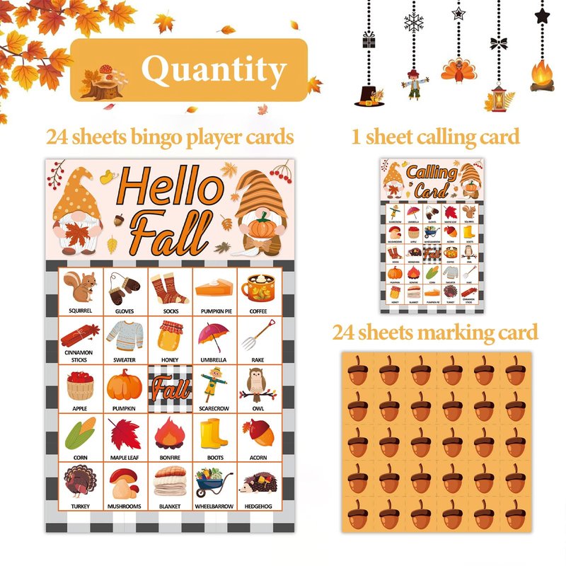 - Fall Bingo Cards for Adults: The fall bingo game set includes 24 sheets fall bingo player cards and 1 sheet calling cards, 24 sheets acorn marking cards, enough fall bingo player cards can let members have fun together. Perfect for Autumn festival and Thanksgiving parties, these bingo game cards will keep adults entertained for hours.