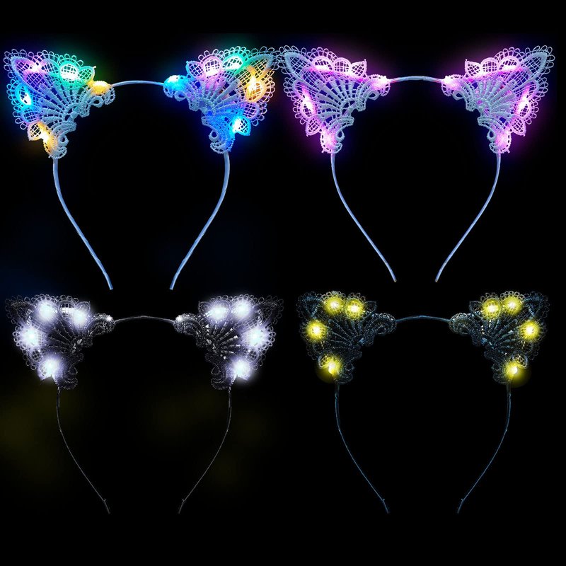 Juexica 4 Pcs Lace Light up Cat Ears Headband LED Lace Cat Ears Headband Hair Accessories for Women Girls Christmas Fancy Dress Cosplay Party Favors