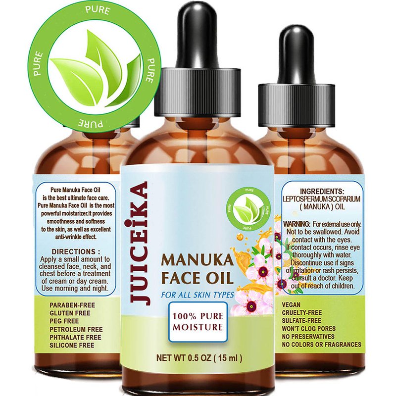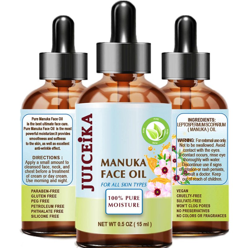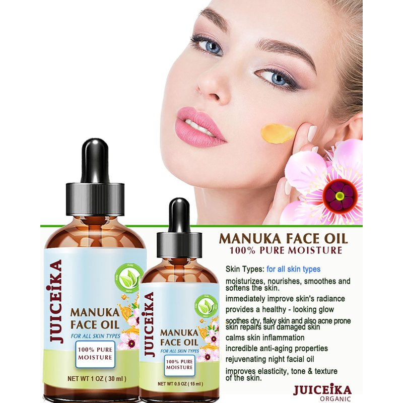 This face oil, Juiceika Manuka Oil also known as Manuka Honey Oil. Absorbs quickly to deeply hydrate and rejuvenate the outer layer of skin from within. Manuka Oil is recommended for normal to dry skin types, as well as the combination, sensitive and maturing skin types. Manuka Oil moisturizes, nourishes, smoothes, and softens the skin. Upon application, the skin immediately feels soft and smooth. Due to the high content of vitamin A, vitamin C, and vitamin E, nutrients, and essential fatty acids, Manuka Oil demonstrates efficiency in fighting deep wrinkles and lines. Linoleic acid in Manuka Oil keeps skin moisturized and is ideal for soothing dry, flaky skin, and also acne-prone skin. Manuka Oil protects skin from moisture loss, eliminates excessive peeling of the skin, restores skin firmness and elasticity, and slows down the aging process.