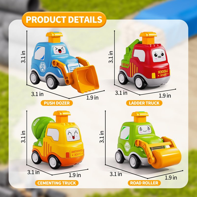 - Press and Go Cars: Toddler ages 1-3 just press the knob on the top and let the toy figure car run forward, and the joints are moveable. The car engineering for kids will develop kids' motor skills and hand-on ability of developmental toys for 1 year old.