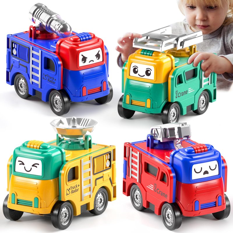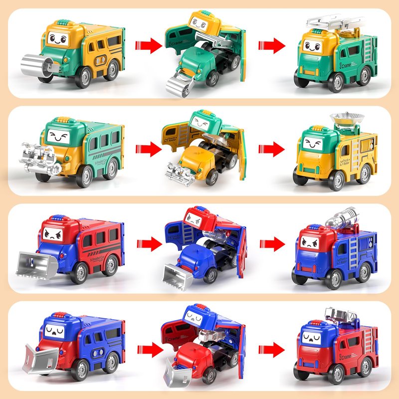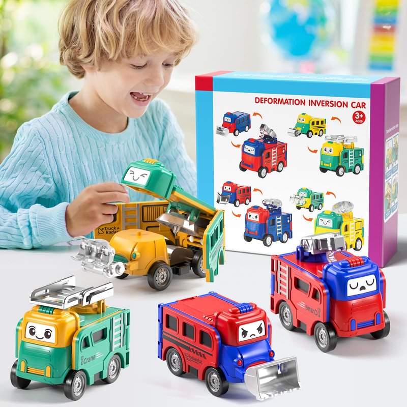 - Flip and Roll Truck: Our car toys features reverse deformation toy car, which 4 engineering toys can transform into 8 construction toys: bulldozer toys, crane truck, pace car, missile vehicle, road roller, ladder truck, grab truck and exploration vehicle.