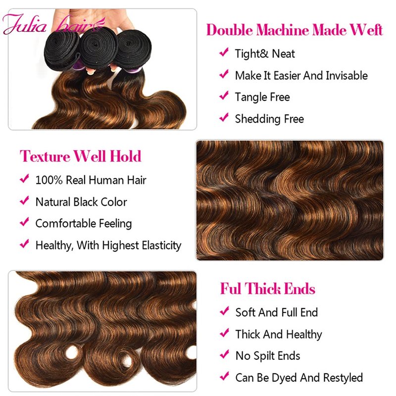 Julia Brown Highlight Ombre Body Wave Human Hair Weave 3 Bundles 14 12 10inch,10A Brazilian 100% Remy Honey Blonde Human Hair Weft Extensions Piano Color