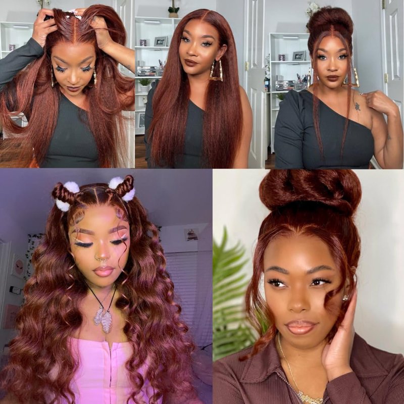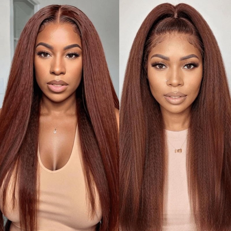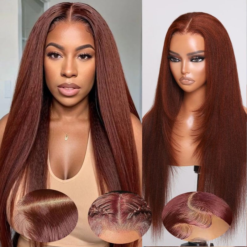 Julia Hair 12A Bye Bye Knots Glueless Wig Reddish Brown Yaki Straight Virgin Human Hair Pre Cut 7x5 HD Lace Front Wigs Invisible Knots Pre Plucked Pre Bleached Auburn Copper Wig 150% Density