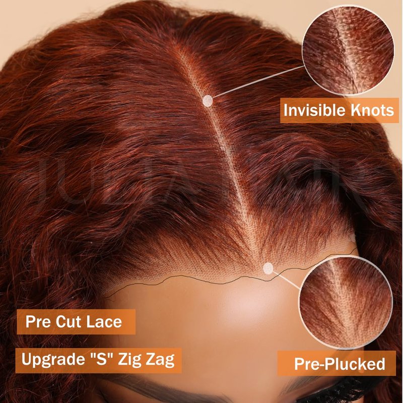 - Glueless wig Pre Cut Lace Wigs Advantage: 7x5 Upgrade Larger Lace Closure Wigs Human Hair is more invisible, Soft and thin, easy to melt. Can make middle part side part as you want. transparent lace wigs, blends your skin perfectly. 150% density Auburn Copper human hair pre plucked, elegant and natural, can be dyed, bleached, premed, straightened and restyled as you like.