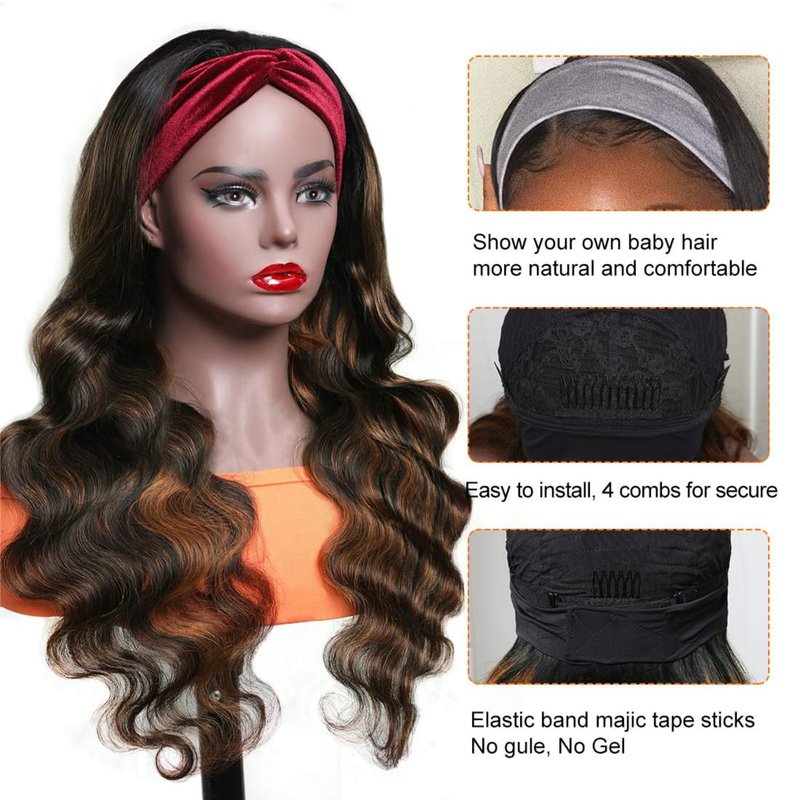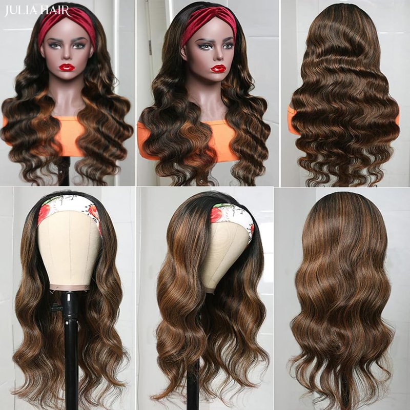 - Julia headband wigs Advantages: FB30 Colored wigs ombre blonde highlight human hair headband body wave wig ,beginner friendly.This headband wig allows you to show your own hairline and edges,looks very natural and realistic.protect your edges well .non lace front wig no glue needed, no sew in. Easy to wear,wear and go wigs.