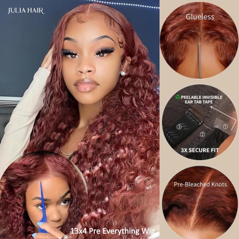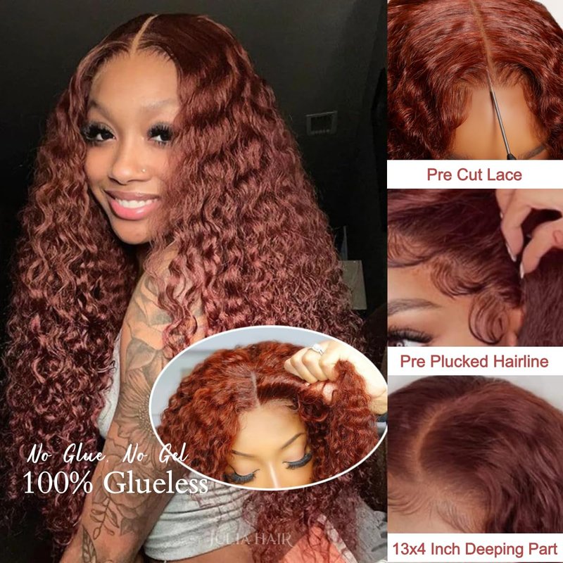 Julia Hair Water Wave Pre Everything Glueless Wig Reddish Brown 13x4 Pre Cut Lace Front Wigs Human Hair For Beginner Pre Bleached Bye Bye Knots Wig Pre Plucked Put on and Go Copper Red Color 16 Inch