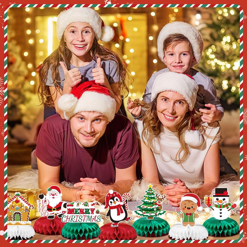 - 【Lovely Christmas Design】Christmas table decorations include 8 kinds of lovely classic Christmas theme design, Santa Claus, gingerbread man, Merry Christmas,gnome, gingerbread house, Christmas tree, reindeer, penguin, snowman, etc as well as red, green, white honeycomb,very eye-catching when placing on the table, making your winter holiday full of festival atmosphere and energy
