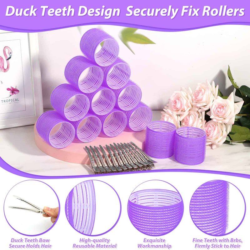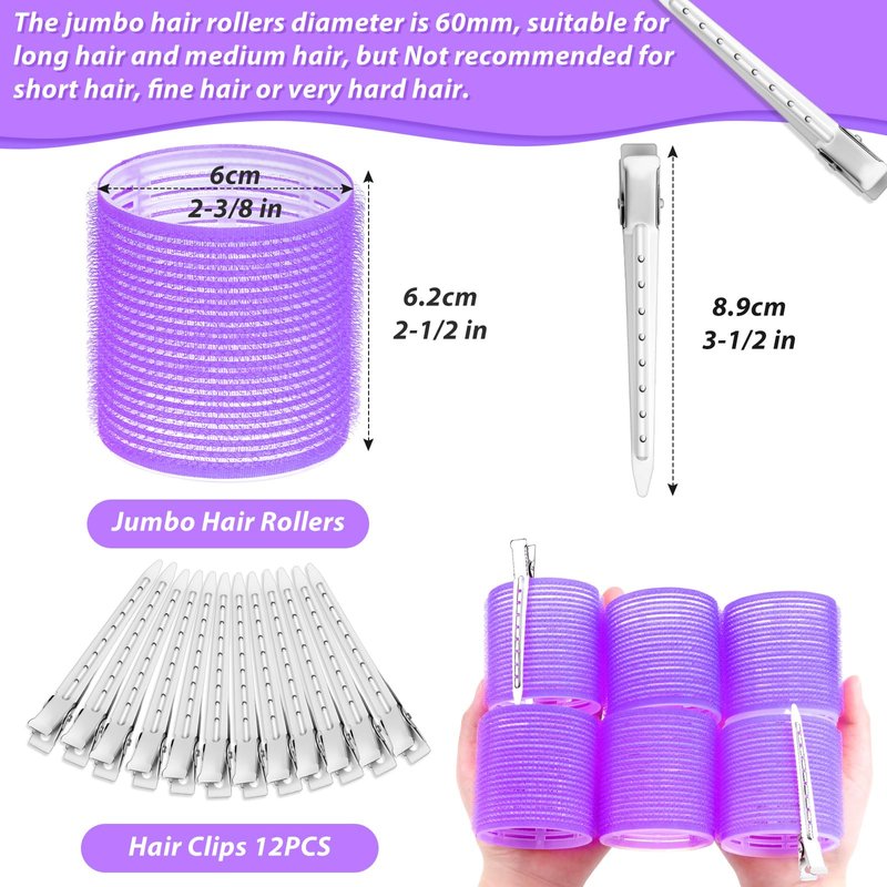 Jumbo Hair Curlers Rollers, 12Pcs Hair Roller Curlers Self Grip Holding Rollers with12 Stainless Steel Duckbill Clips for Long Hair Volume (Purple)