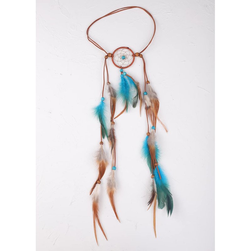 Jumwrit Bohemian Dreamcatcher Feather Headband Indian Gypsy Headpiece with Blue and Brown Feather Tassel Elastic Band Beaded Hairband Hippie Costume Accessories for Women and Girls