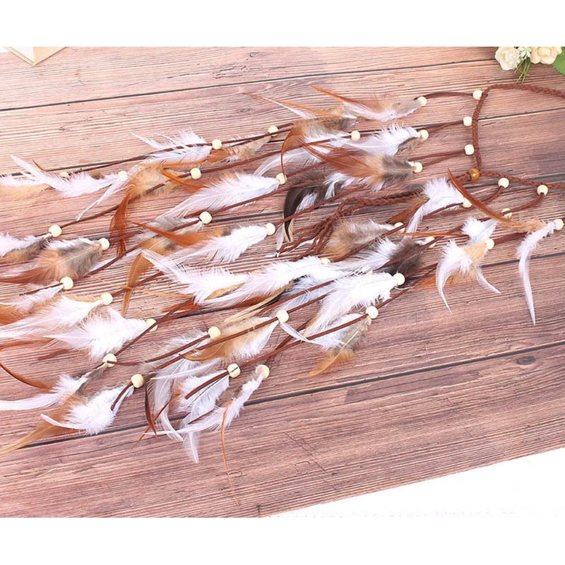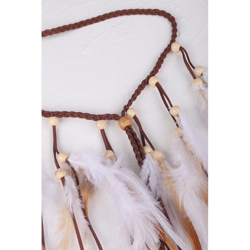 Jumwrit Bohemian Feather Headband Indian Gypsy Headpiece with White and Brown Feather Tassel Adjustable Braided Rope Beaded Hairband Hippie Accessories for Women and Girls