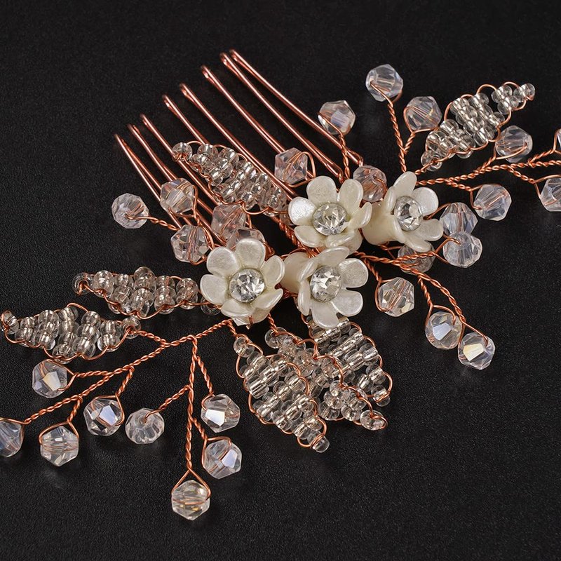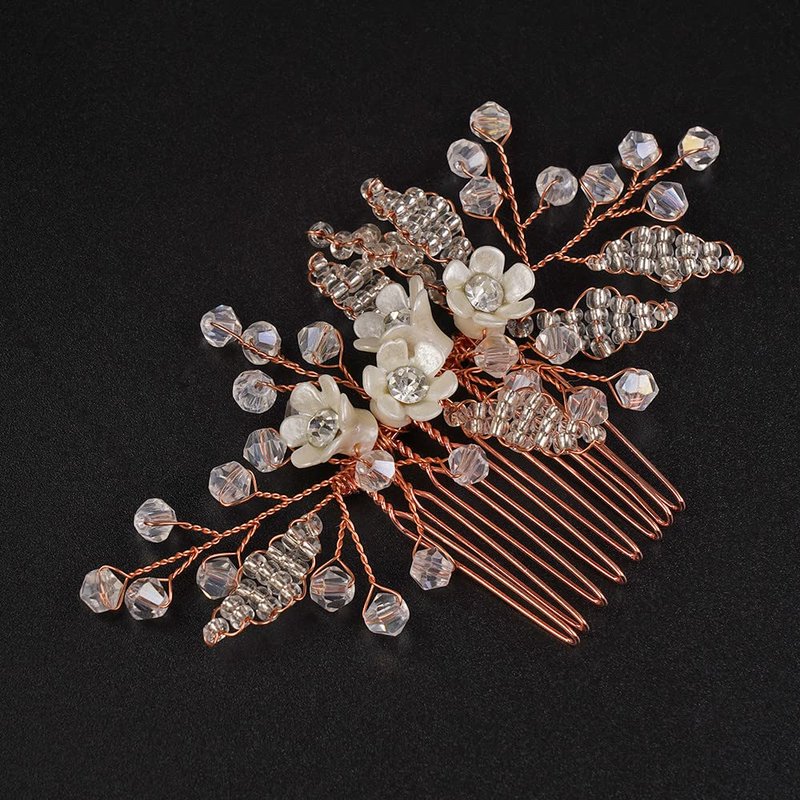 Jumwrit Rose Gold Bridal Hair Comb Wedding Rhinestone Hair Comb Handmade White Flower Hair Comb Headpiece Bride Hair Accessories for Wedding Women Bridesmaid(Rose Gold)
