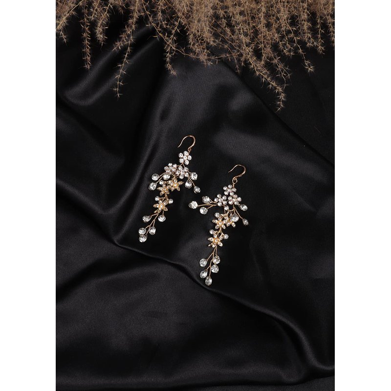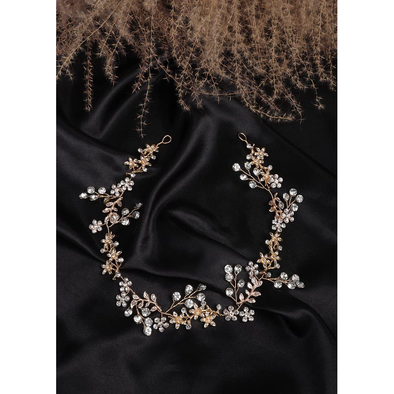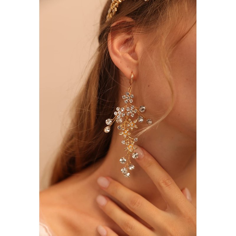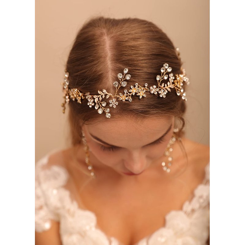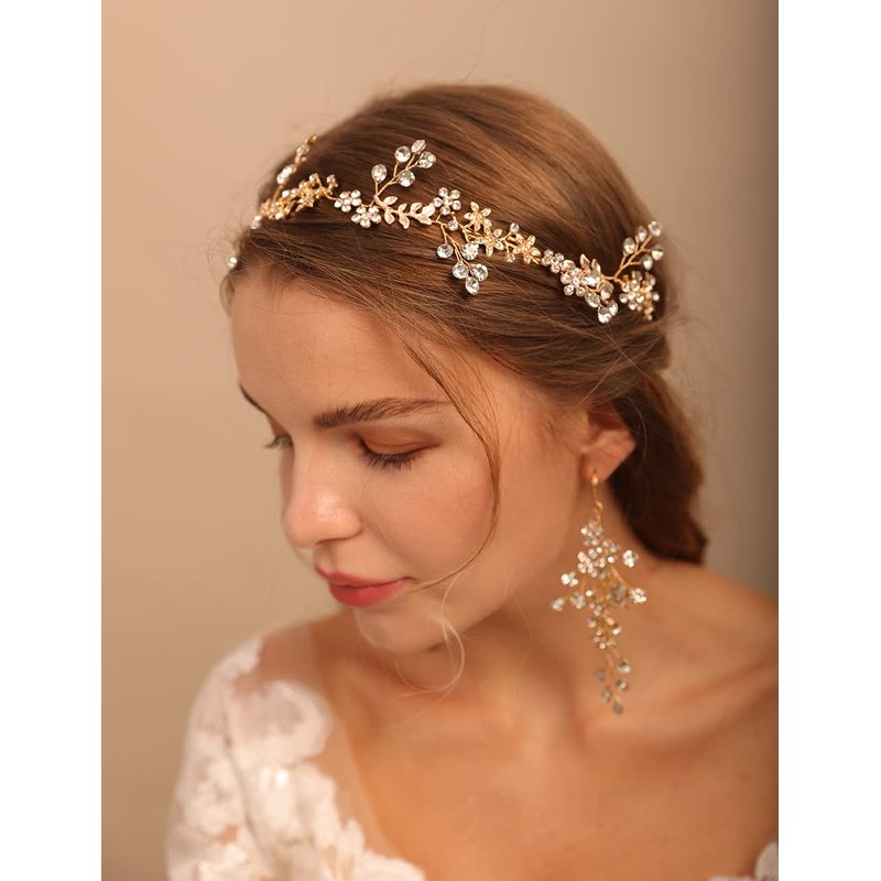 Jumwrit Wedding Headband Earrings Set Handmade Rhinestone Crystal Headpiece Flower Leaves Hair Band Dangle Earrings Bridal Hair Accessories for Women Girls Bride Bridesmaid(Gold)