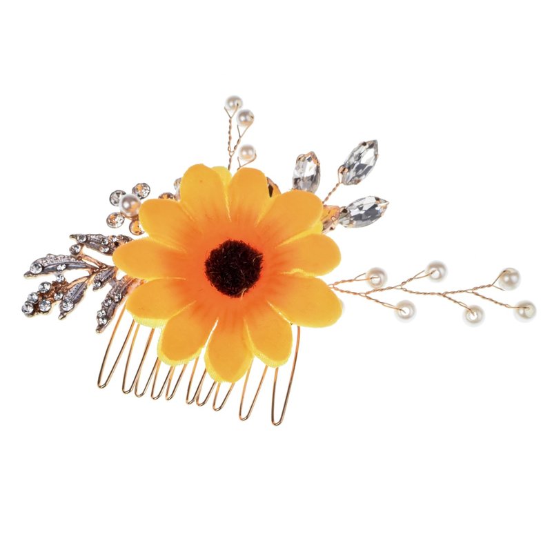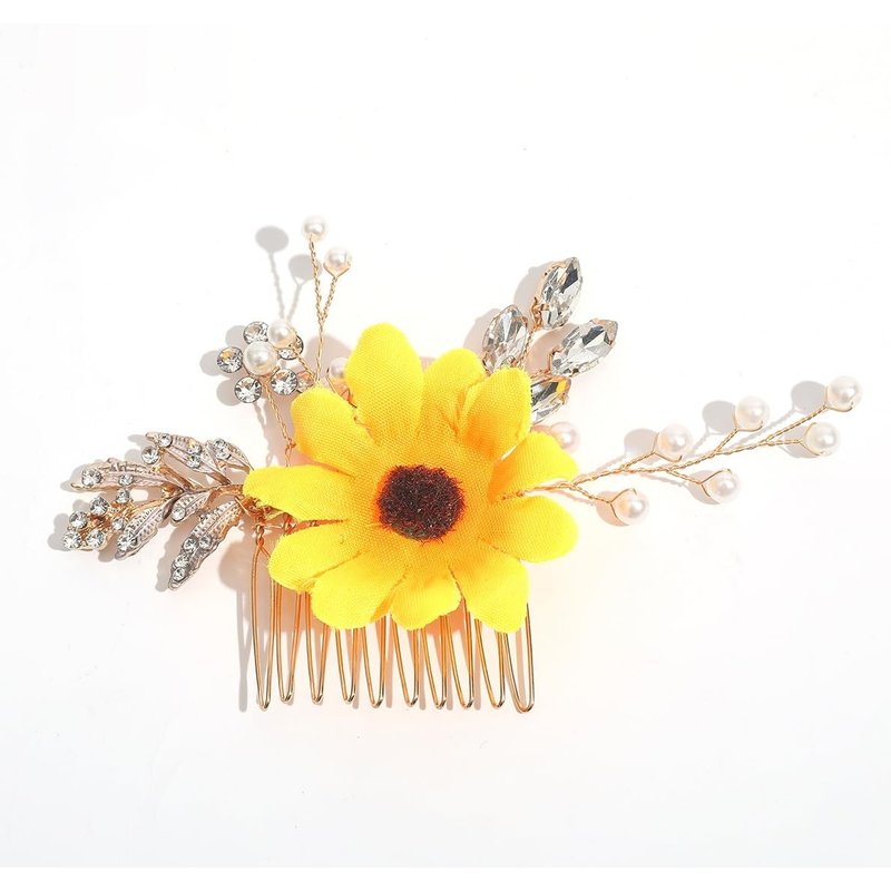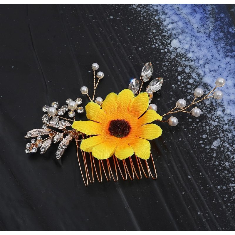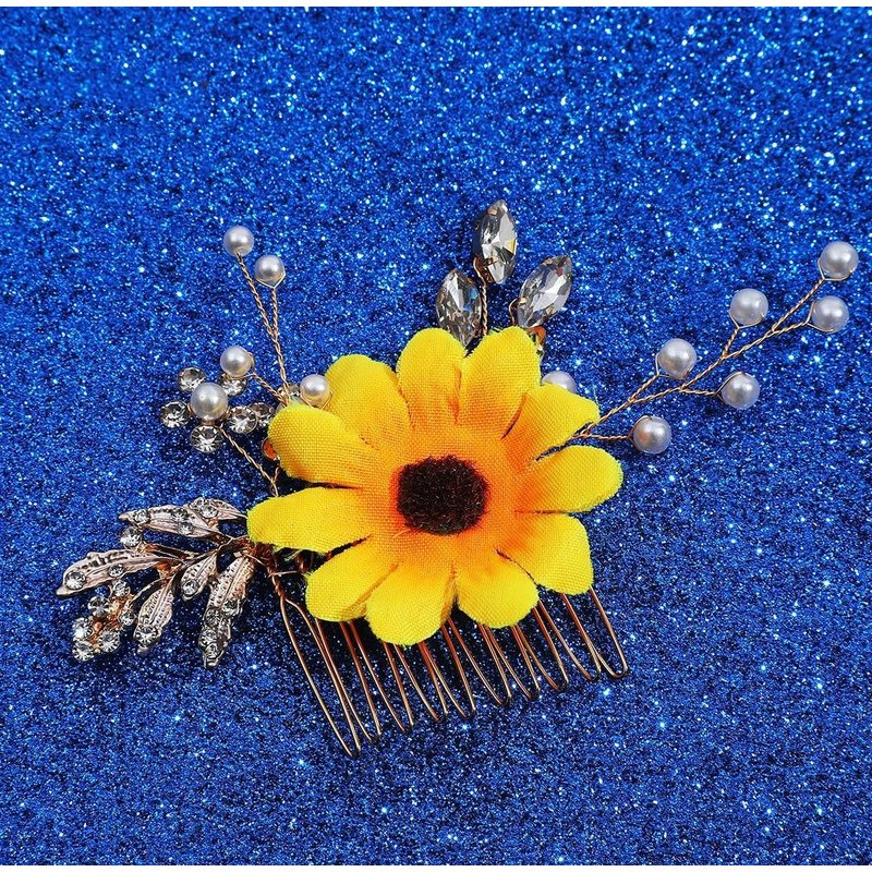 June Bloomy Bride Wedding Sunflower Hair Comb Pearl Flower Hair Piece Rhinestone Hair Accessories (Golden Sunflower)