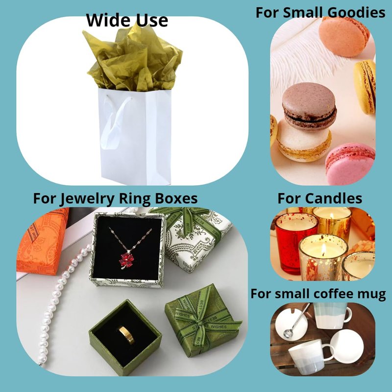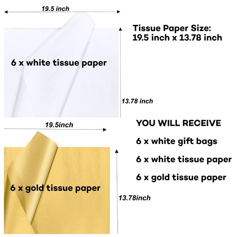 - Little Gift bag with Tissue Paper: We matched 6 tiny white retail bags with 6 pieces gold tissue paper and 6 pieces white tissue paper. which will be more convenient for you to wrap your gifts to be more noble and beautiful.