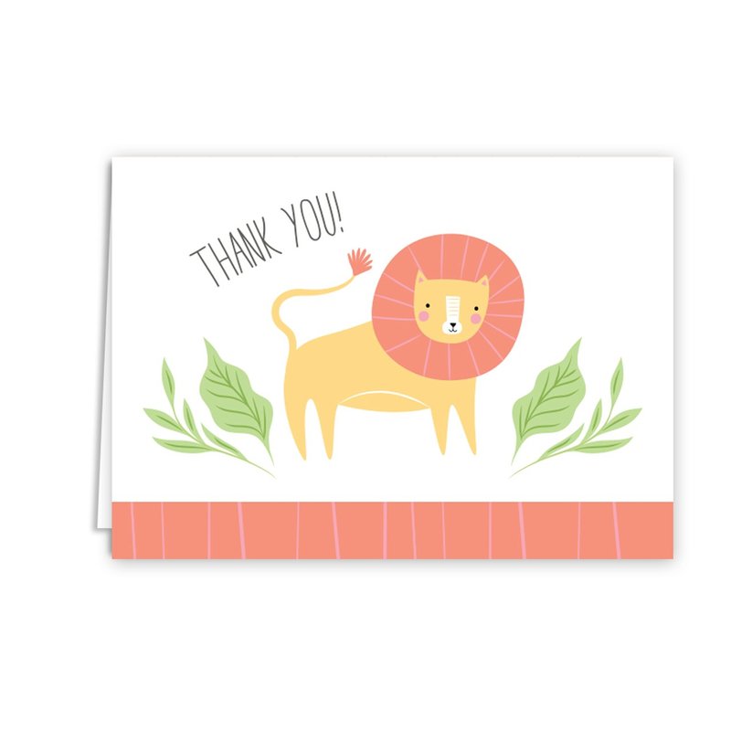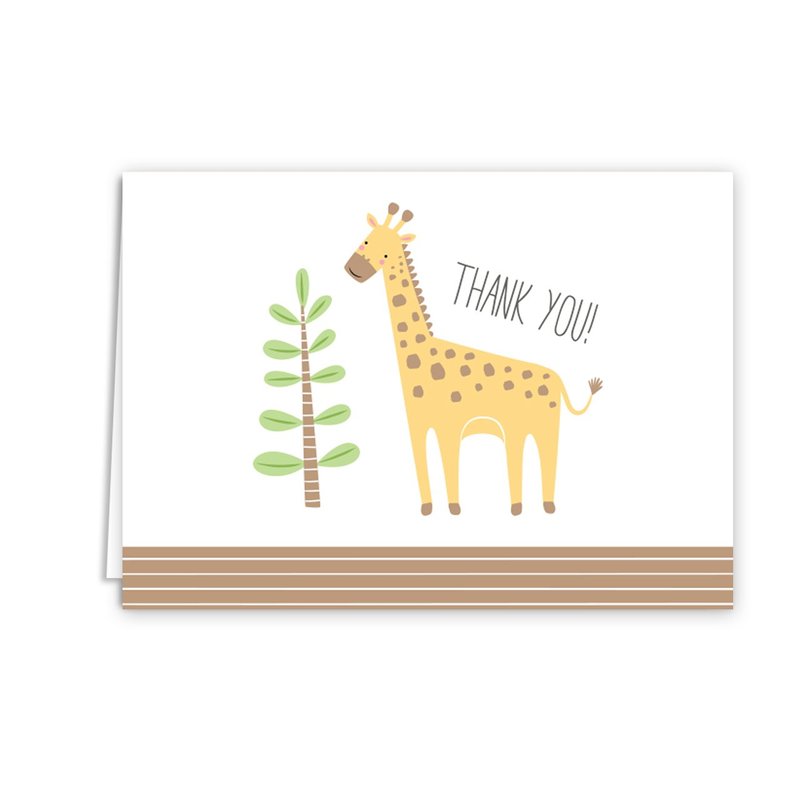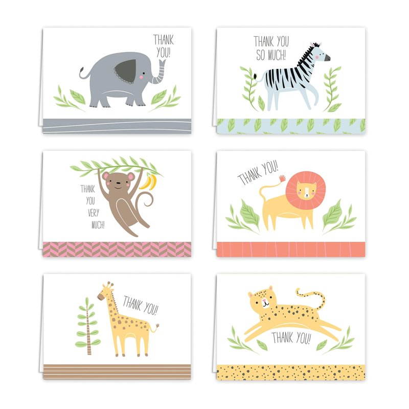 - Design: Adorable jungle animal thank you cards. There are cards of each design. Cards feature a zebra, elephant, monkey, lion, cheetah, and giraffe. Click on the alternate images to display each design included in pack. Cards are printed on high quality white cardstock.
