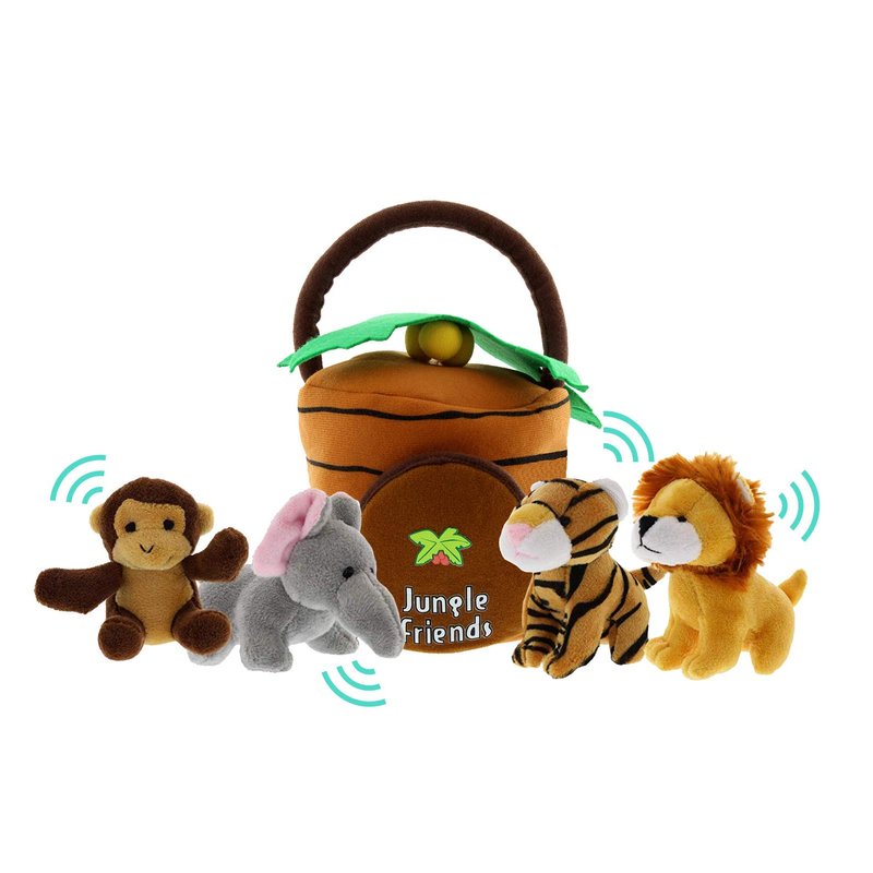 - INTRODUCE YOUR BABY TO SAFARI STUFFED ANIMALS – What a fun way to introduce your child to the animals of the jungle! This set includes a stuffed monkey, stuffed lion, stuffed tiger, and stuffed elephant that make their animal noise when you give them a squeeze. Each set also includes a plush jungle house that snugly fits all 4 animals. The perfect gift for 1 year old girls and boys