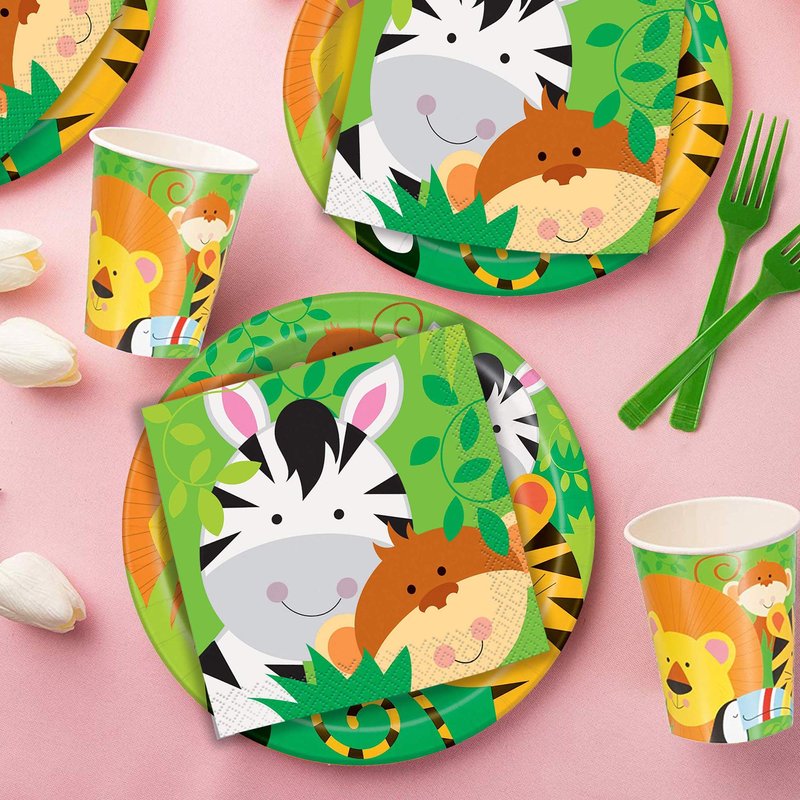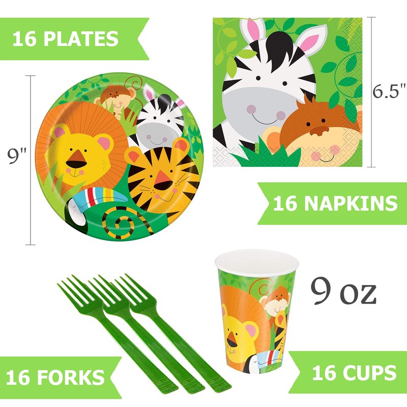 - Zoo Jungle Animal PARTY DECORATIONS SET: This Zoo Jungle Animal party supplies kit includes everything for a happy celebration for 16 persons: Zoo Jungle Animal plates, paper cups, napkins, forks, foil balloons, latex balloons