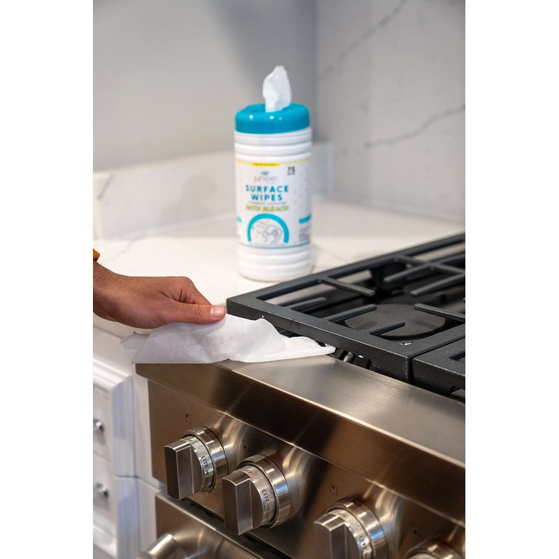 - 【 EFFECTIVE SURFACE CLEANING WIPES】 All purpose cleaner wipes are tough on grease and bathroom soils and cut through grime on a variety of hard surfaces throughout your home including wood, granite, stainless steel and more., Surface cleaning wipes with bleach are perfect for in my kitchen and in my bathrooms. In the bathrooms you can take one wipe and quickly wipe areas down throughout the day and In the kitchen, you can use these for wipe down my counter tops.