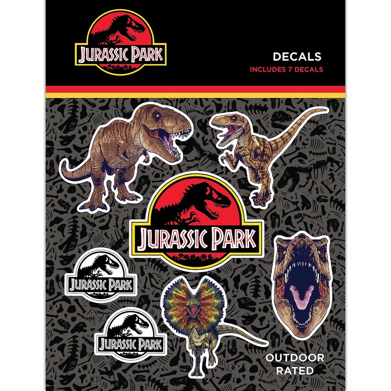- Set of 7 Jurassic Park Decals - Our Jurassic Park decals look great on any smooth surface. Decorate your water bottles, laptop, notebook, or even your cars! This value pack, proudly made in the USA and officially licensed by Universal Studios, includes a total of seven high-quality decals that capture the essence of Jurassic Park.