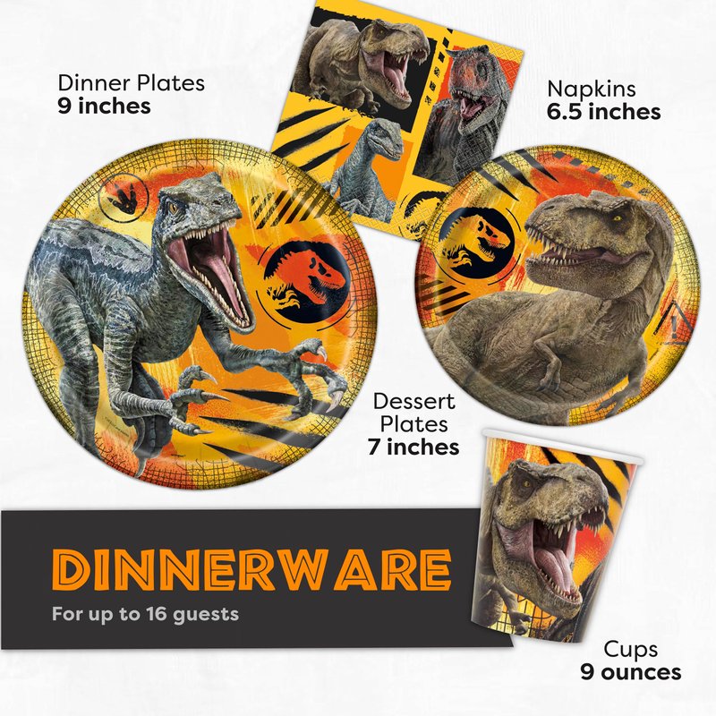 - Includes -- This set includes enough Jurassic World party supplies to host a party of 16 guests: 1 table cover, 16 9" Jurassic World plates, 16 7" Jurassic Park plates, 16 paper cups, 16 paper napkins, and 1 Happy Birthday Button.
