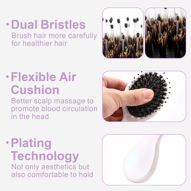 - 【Hair Care】The boar bristle can distribute natural oil from scalp to the tip of the hair,which can prevent hair from drying out.And the boar bristles are less prone to static electricity.Daily uses will effectively smoothes frizzy hair and adds shine.