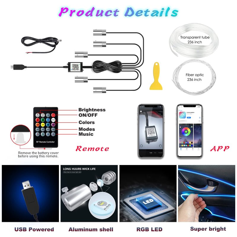 - [Package & Warranty]: 1 x 5 in 1 LED car light, 236" fiber optic and tube, 1 x RF remote, 1 x USB cable, 1 x positive and negative cable, 1 x Pry tool, 1 x manual. One year warranty, lifetime technical support. Full refund or free replacement for any issues (Contact us directly EVEN IF AFTER the Amazon return window).
