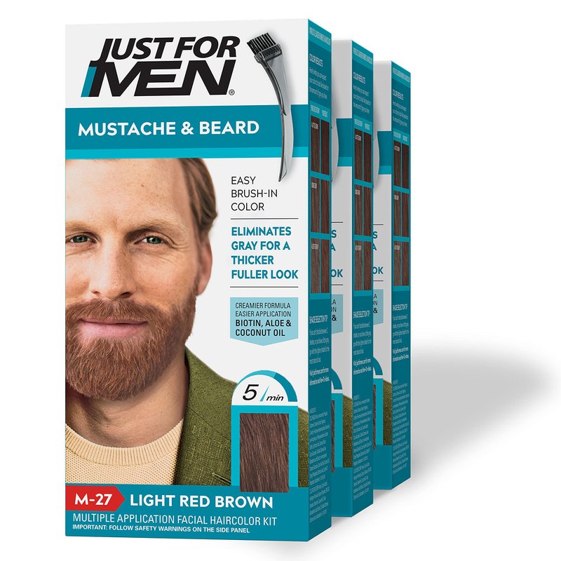 - Just for Men Mustache & Beard, light red brown is beard coloring that makes getting rid of gray facial hair easy. Unlike other dyes, this beard color is formulated specifically for coarser facial hair. Eliminates gray for a thicker and fuller look.