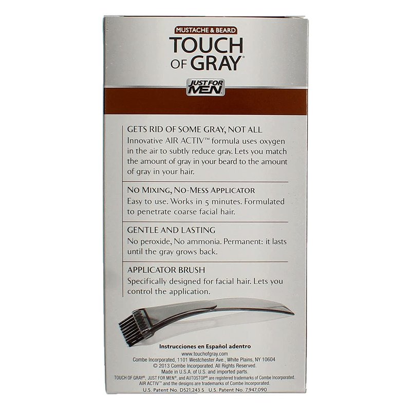 JUST FOR MEN Touch of Gray Hair Color, Mustache & Beard Kit, Light & Medium Brown B-25/35, 1 ea (Pack of 5) - Designed specifically to cover gray hair on coarser facial hair, Just For Men touch of gray mustache and beard is a male grey hair dye that gets rid of some smoky gray hair, but not all. It works gradually. The innovative formula reduces men's gray hair without getting rid of it completely. The applicator brush is specifically designed for getting the mustache coloring into facial hair and lets you control the application. With each application, this Just For Men gel reduces the amount of gray. The change is subtle. And even with repeated applications, the anti-gray hair gel won't get rid of all the gray. The gray-blending hair color is gentle and long-lasting there's no ammonia or peroxide. And yet, the natural look you get from this mustache coloring lasts until your gray grows back. We believe in the freedom of grooming. Men should feel free to look however they wish to look, with or without gray hair. When men want to enhance, reduce, or get rid of their gray, they choose our gray hair products. Important: Follow the usage advisory on the side panel. Haircolor can cause allergic reactions. Follow the usage advisory. Usage Advisory: Haircolor products can cause allergic reactions which in rare cases can be severe. Temporary black henna tattoos may increase your risk of allergy. Do not use this or any other hair coloring product if you have experienced a reaction to a temporary black henna tattoo in the past. Before using this product, you must perform a preliminary 48-hour skin allergy patch (alert) test according to the accompanying directions. Do Not Use this Product if: You have already experienced any reaction to this or any other hair color product. You have an irritated, sensitive, or damaged scalp.