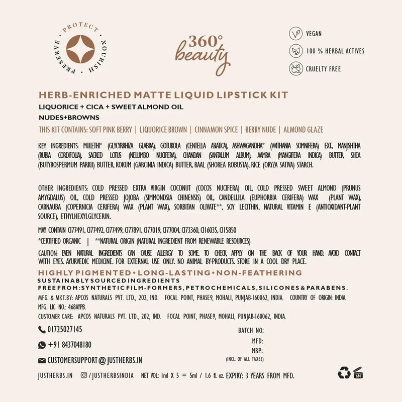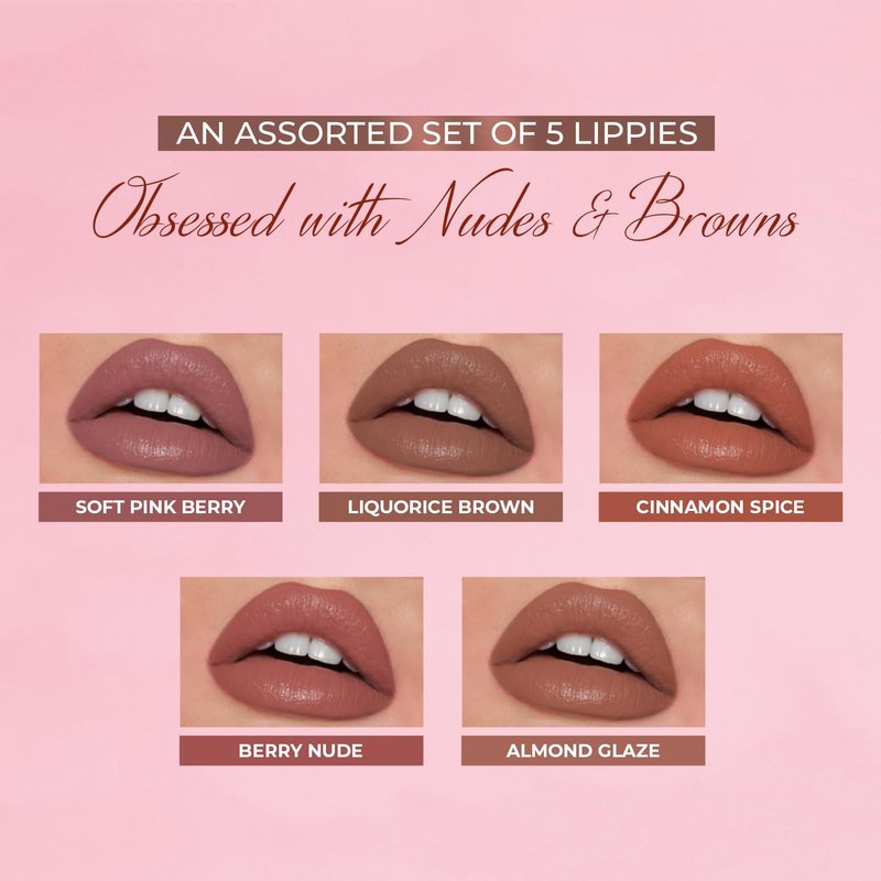 Just Herbs Organic Liquid Lipstick Kit Set of 5, Hydrating & Lightweight Lip Color - Paraben & Silicon Free - 1.6 fl oz. (Nudes & Browns)
