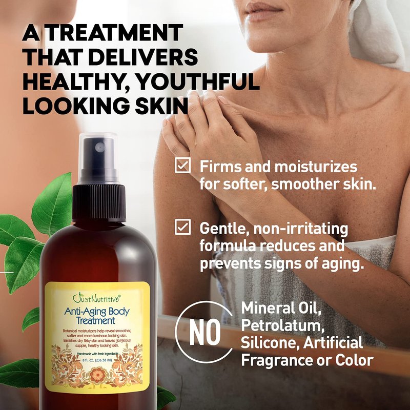 - EXPERIENCE THE GENTLE POWER OF NATURE | Imagine easily improving the look and feel of your skin each day by simply applying this Anti-aging Body Treatment. This body moisturizer’s gentle, non-irritating formula reduces and prevents signs of aging. You can enjoy its benefits without preservatives, parabens, alcohol, or sulfates. It has no mineral oil, no petrolatum, no silicone, no artificial fragrance, and no artificial color. You can use this underneath your sunscreen or body lotion.