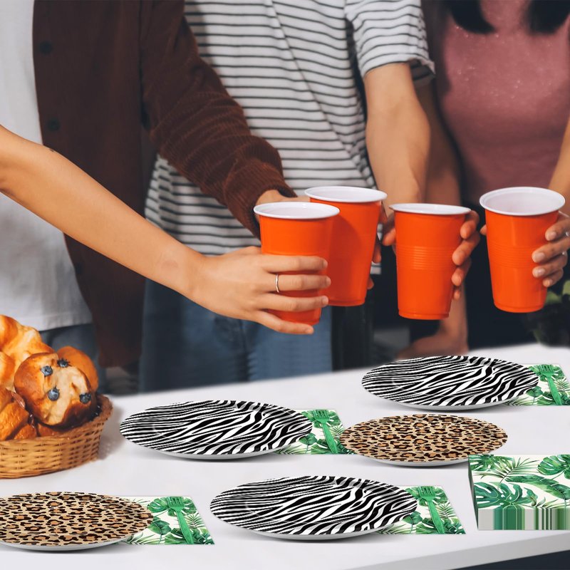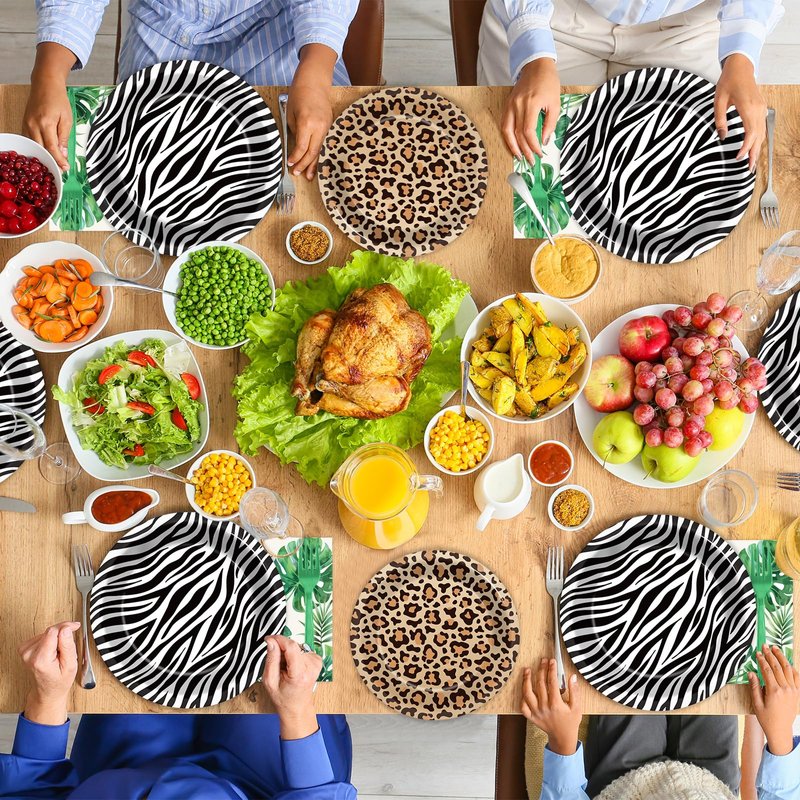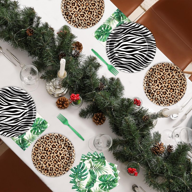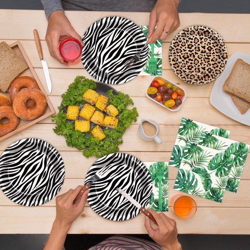 - Unique design: The unique design of this set features fun and playful elements, such as zebra stripes, leopard spots, and palm leaf patterns, making it ideal for kids and adults alike. The jungle-themed tableware brings a lively and adventurous vibe to any party, capturing the spirit of the wild.