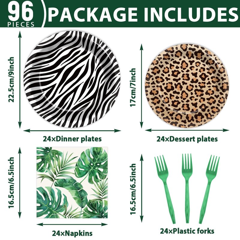 - Package includes: You'll get 24 pieces of jungle animals party paper dinner plates of 9in, 24 pieces safari themed birthday party dessert plates of 7in, 24 pieces of jungle party napkins 6.5in, and 24 pieces of plastic forks for each set that can serve 24 guests.