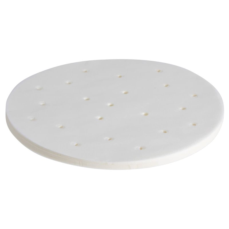 Parchment paper sheets are a great addition to cook's or baker's kitchen supplies. These cellulose-based composite sheets are resistant to grease and won't easily stick to food. Unlike waxed paper or paraffin paper, steam dumpling paper liner can safely withstand the high temperatures associated with baking and air frying without burning, making them great for baking pizzas or cookies. These 8-inch round steamer paper liners for air fryer basket are designed for use in bamboo steamers and round air fryers. The perforated design ensures that air and steam can rise, without forcing the paper into contact with the heating element at the top. Made of 39gsm white parchment paper, these perforated liners are great for steaming dumplings, bun, and dim sum, as well as large vegetables, such as broccoli, cauliflower, and Brussels sprouts. Designed to withstand temperatures up to 428 degrees Fahrenheit, these steamer sheets are also great for baking small, 6-inch personal pizzas. WARNING! Parchment paper will burn if it comes into contact with a heating element. Always ensure the liner is weighed down with food to prevent it from being lifted by steam or air, forcing it into contact with a heating element.