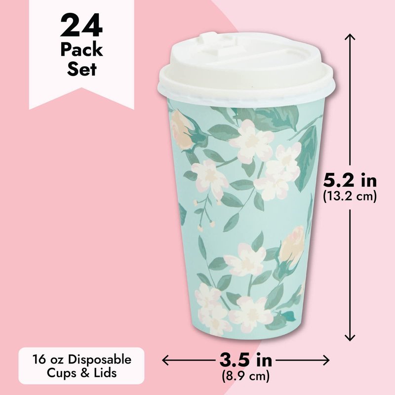 - Dimensions: These floral throw-away coffee cups with lids have a 3.5-inch top diameter, stand 5.2 inches in height, and can hold up to 16 ounces of hot or cold liquid