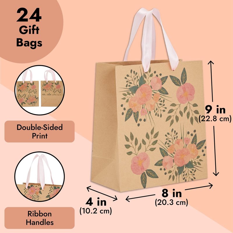 This set of 24 beautifully designed floral gift bags is a quick and easy packaging solution for any celebratory occasion, trade show, or retail shop. The vibrant pink flowers are ideal for creating personalized bridal or bags or to add to a girl's party supplies, baby shower, wedding, birthday, and small business! Each one of our gift bags with ribbon measures 8.0 x 4.1 x 9.1 inches, perfectly sized to hold sweet treats, small gifts, or jewelry. The high-quality kraft paper gift bags medium size design can easily be customized with markers, stickers, or stamps.