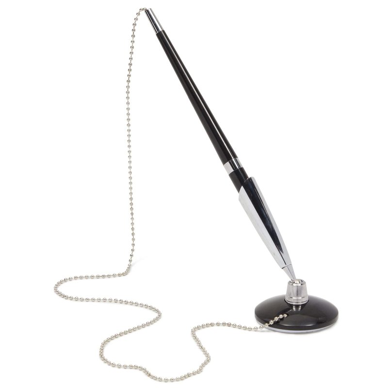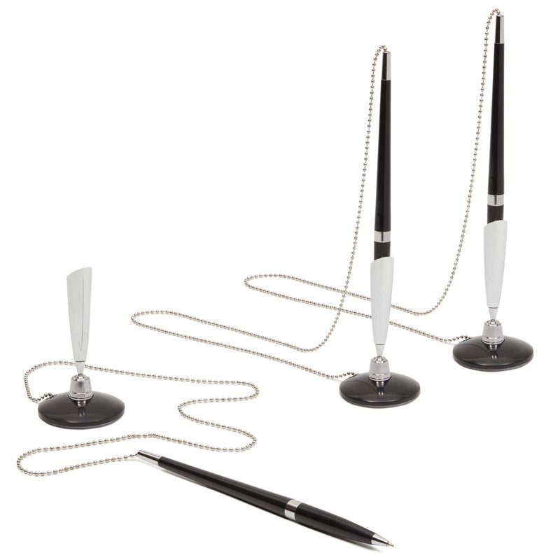 - Pens with Chain: These front desk pens are perfect for use in public lobbies, banks, retail stores, hotels, or small businesses. The ball chain attachment and standing base provide secure and easy accessibility. With their high-quality construction and good value, these pens offer a reliable solution for your writing needs in various settings