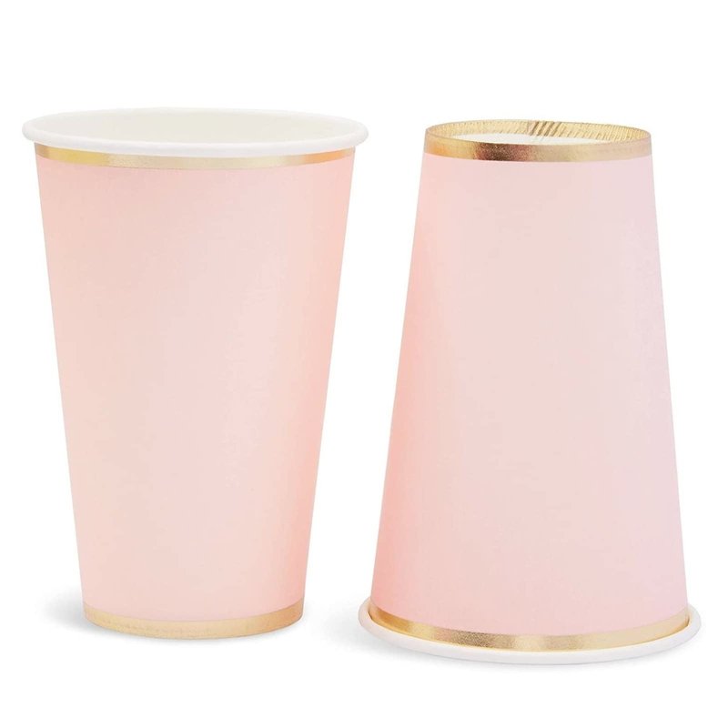 - 12-Ounce Paper Cups: Add these pink and gold cups to the dining table setting, or use them at your buffet and dessert table to bring celebratory decor to all areas of your event
