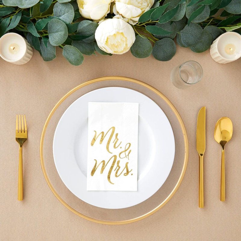 - Elegant Design: Enhance rehearsal dinners or engagements with this set of white wedding napkins, adorned with metallic gold foil lettering that spells out "Mr. and Mrs.," adding a touch of romance