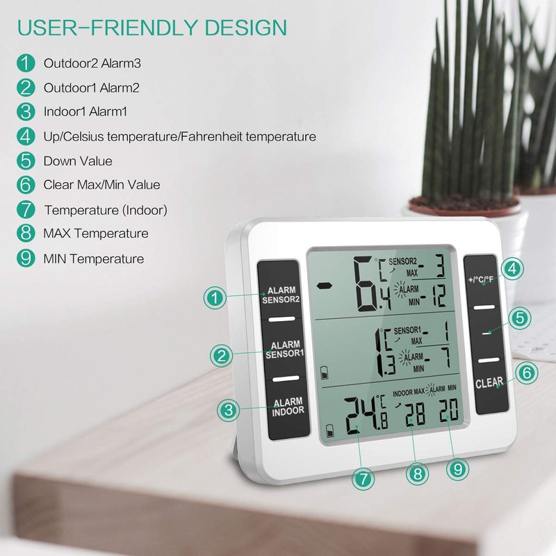 - Easy to use: There are 6 function buttons on the weather station and a signal display on the transmitter. Simply press the corresponding button to turn the alarm on/off, switch Celsius or Fahrenheit and delete the MAX/MIN data sets. The compact and user-friendly design makes it perfect for all types of refrigerators or freezers.