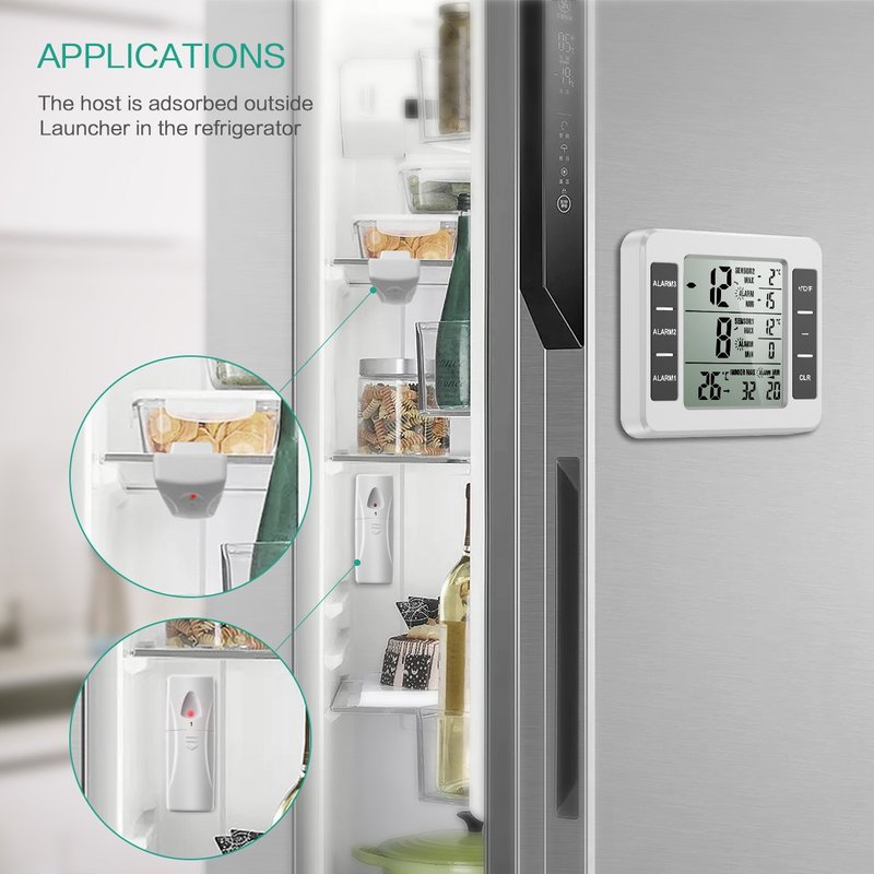 - Audio alarm reminder and max/min recording: This wireless fridge thermometer has acoustic alarm function. You can set the maximum and minimum alarm value manually. The audible alarm sounds when the temperature value reaches the preset limit for the maximum or minimum alarm value. Records Min and Max Temperature delivers historical temperatures in the last 24 hours.