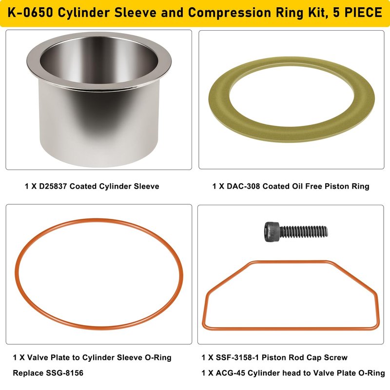 - The K-0650 Cylinder and Piston Ring Replacement Kit fits many model Oil-Free air compressors