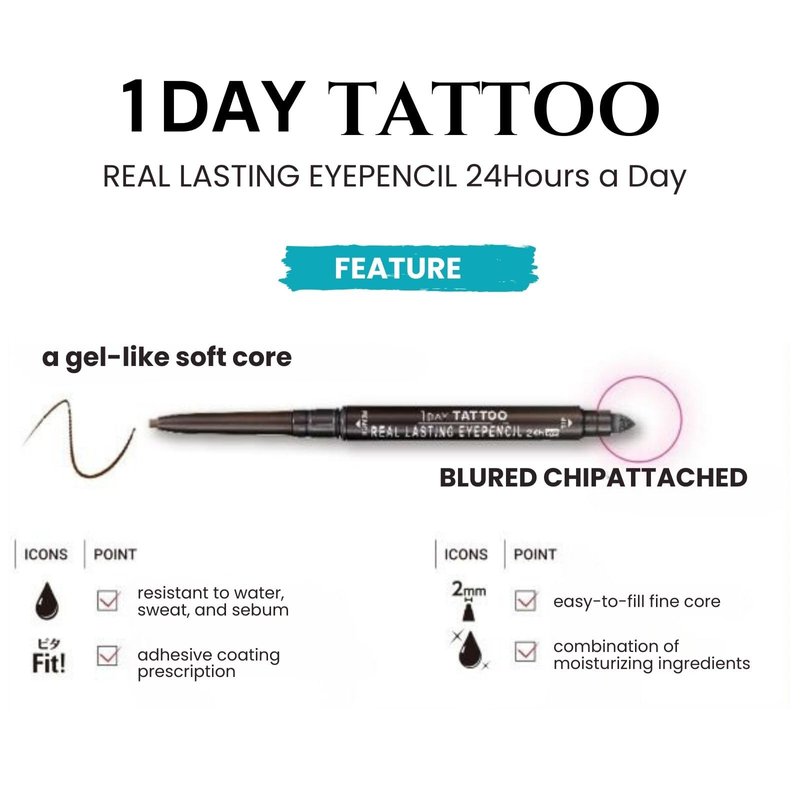 Discover the perfect blend of durability and precision with the K-Palette 1Day Tattoo Waterproof Eyeliner Pencil. Designed for long-lasting wear, this ultra-smooth eyeliner pencil glides effortlessly along the lash line and waterline, providing rich, vibrant color that stays put all day. Its waterproof and smudge-proof formula ensures your eye makeup remains flawless, even in challenging conditions. Whether you're aiming for a subtle, everyday look or a bold, dramatic style, this versatile eyeliner pencil delivers the perfect finish. Compact and easy to carry, it’s the ideal choice for on-the-go touch-ups, ensuring your eyes are always beautifully defined.【INGREDIENTS】Trimethylsiloxysilicate, Methyl Trimethicone, Cyclopentasiloxane, Polyethylene, C18-38 Acid Glycol Ester, Acrylates/ Stearyl Acrylate/ Dimethicone Methacrylate Copolymer, So-dium Hyaluronate, Soluble Collagen, Swertia Japonica Extract, Chamomilla Recutita (Matricaria) Flower Extract, Rosmarinus Officinalis (Rosemary) Leaf Extract, Hibiscus Sabdariffa Flower Extract, Argania Spinosa Kernel Oil, Squalane, Water, Butylene Glycol, Silica, Citric Acid, Sodium Citrate, Toco-pherol, Methylparaben, Phenoxyethanol, Iron Oxides, Methyl Methacrylate Crosspolymer, Ferric Ammonium Ferrocyanide, Aluminum Hydroxide, Titanium Dioxide