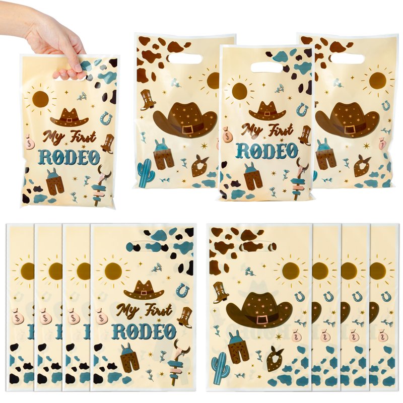 - Blue Cowboy 1st Plastic Gift Bag: Celebrate a "My First Rodeo" with these blue Cowboy 1st plastic gift bags. Ideal for commemorating a special occasion, they add a personalized touch to your party favors.