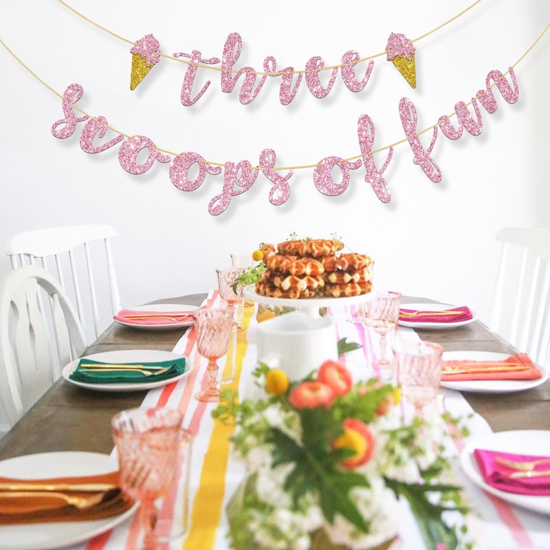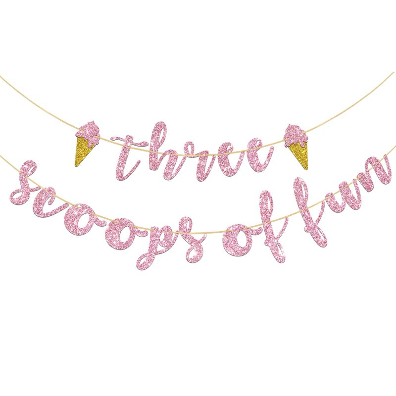 Kaakswa Three Scoops of Fun Birthday Banner, Ice Cream 3rd Birthday Decorations for Girls, Summer Ice Cream Theme Three is So Sweet Birthday Party Supplies, Pink Glitter