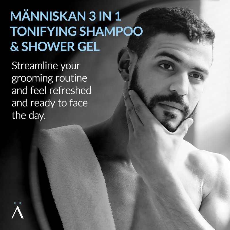 - EFFORTLESS GROOMING SOLUTION: Streamline your daily care ritual with Människan's 3 in 1 Tonifying Shampoo & Shower Gel. Its carefully crafted formula ensures a thorough cleanse without stripping away natural oils, leaving you feeling refreshed and ready to face the day.