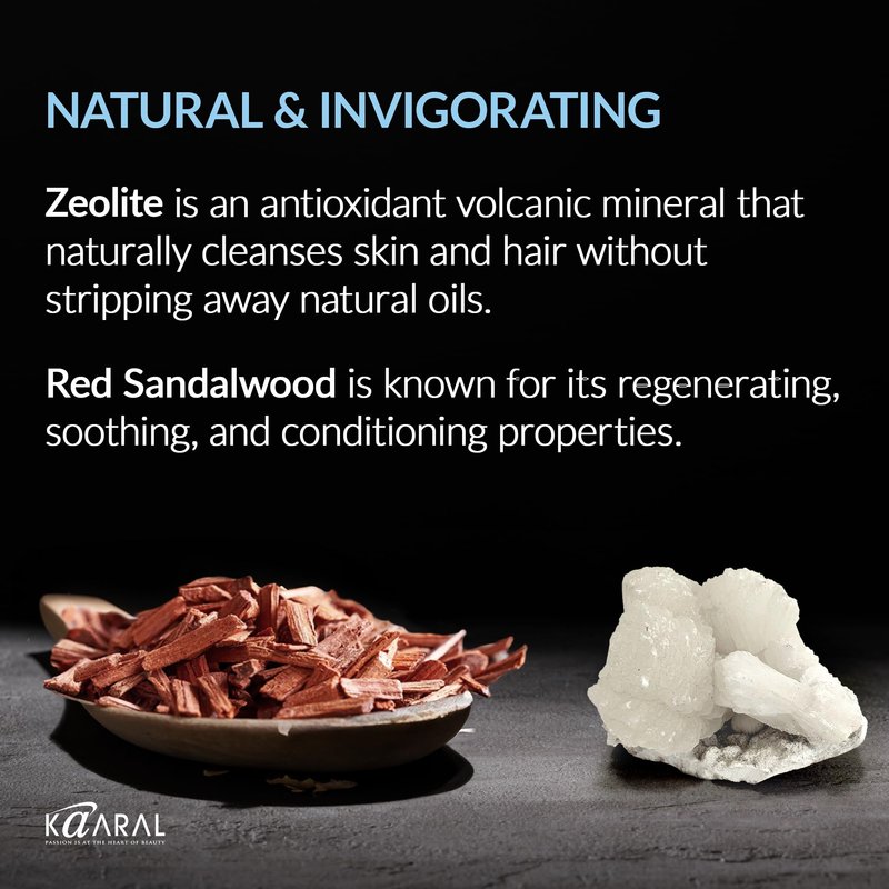 - NATURAL, INVIGORATING ELEMENTS: Experience a light, invigorating sensation with a mix of natural ingredients. Zeolite, a volcanic mineral, detoxifies and protects with its antioxidant properties, while Red Sandalwood soothes, regenerates, and conditions your hair, beard, and skin.