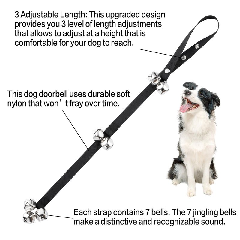- 2 Pack Rugged Nylon Strap: Each strap contains 7 bells. The 7 jingling bells make a distinctive and recognizable sound. Our dog doorbells are reinforced nylon and lead-free bells. The end is a loop that attaches over a door knob, lever-type handle or hook. It even works with many sliding glass doors.
