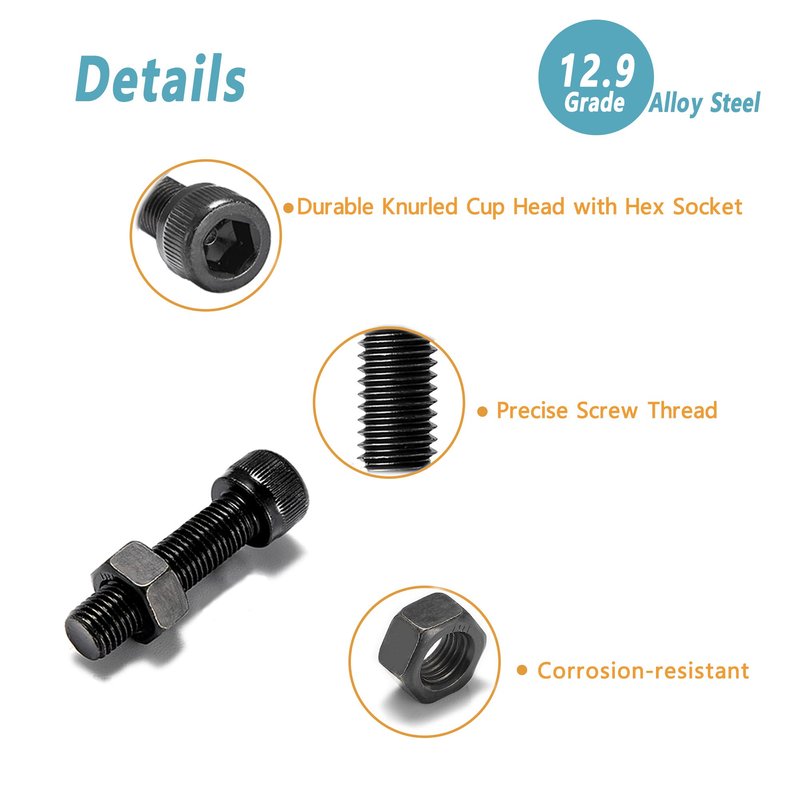 - 【Easy to operate and strong】 Hex socket head cap screws can be screwed into the nut directly by hand without a wrench, Grade 12.9 alloy steel screws are ultra-high strength and not easy to break.