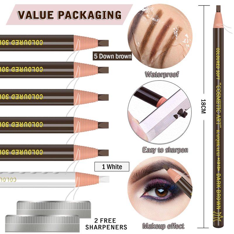- 1.【6 Advanced thrush pens】2 Colors ( 5 Dark brown +1 White ) , GIFT:2 Sharpeners. Material: Paper roll . Size: 18cm x 6mm. Weight: 11g.