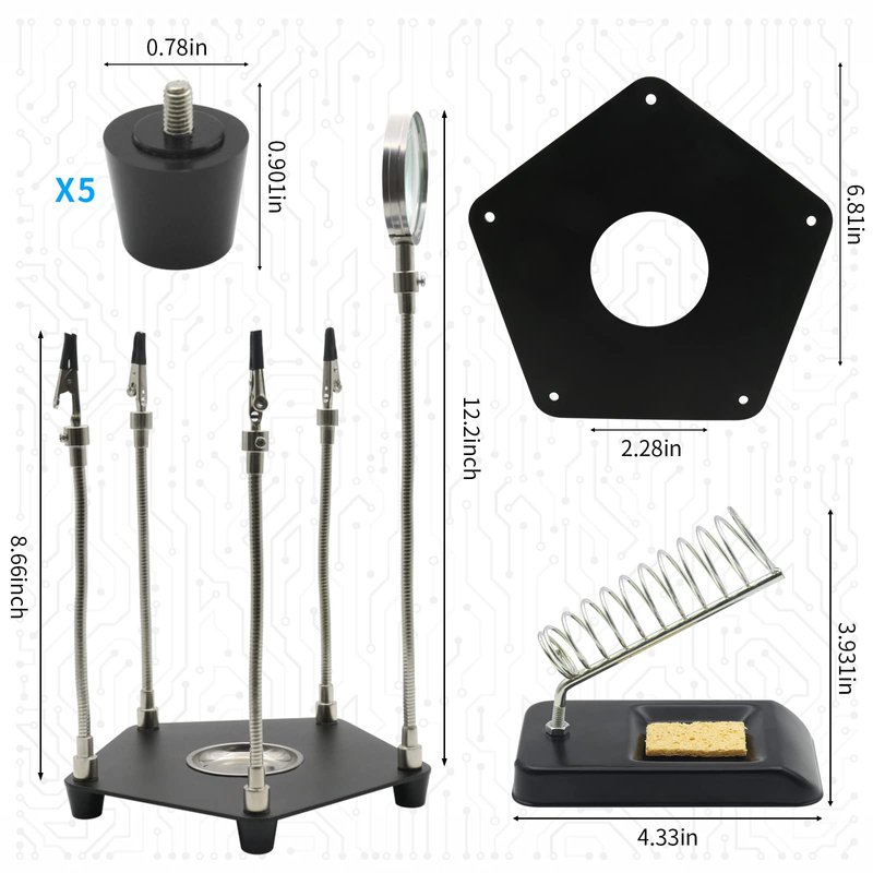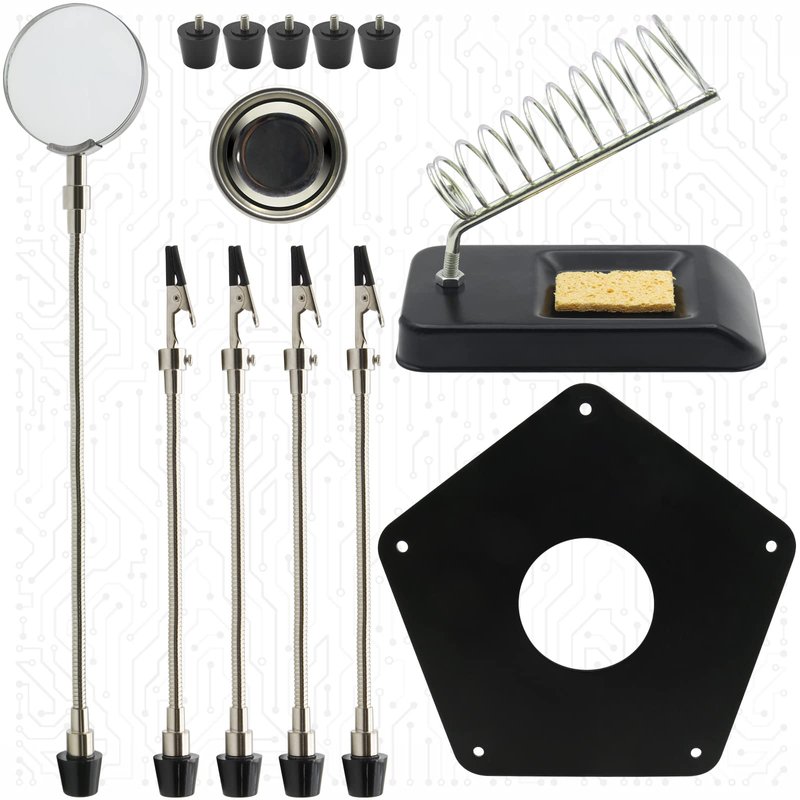 - 【What You Get】This soldering helping hand set included: 4 x Alligator Clips, 1 x Magnifier, 5 x Flexible Metal Arms, 1 x Pentagonal Powder Coated Steel Base, 1 x Screwdriver, 5x Rubber Feet, 1 x soldering iron stand, 1 x Installation Instructions. Kaisiking 90 Days Refund and Replacement Policy.